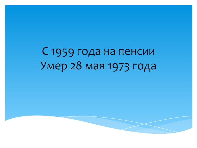 Слайд 7С 1959 года на пенсии Умер 28 мая 1973 года