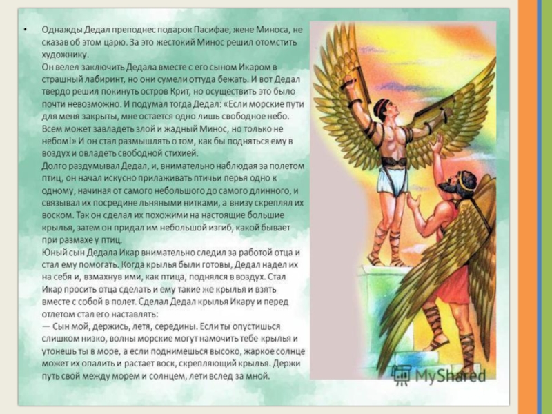инструментов, ни машин, жил в Афинах великий художник Дедал. Он первый научил греков строить прекрасные здания. До него художники не умели изображать людей в движении и делали статуи, похожие на запелёнатых кукол с закрытыми глазами. Дедал же стал высекать из мрамора великолепные статуи, изображающие людей в движении.