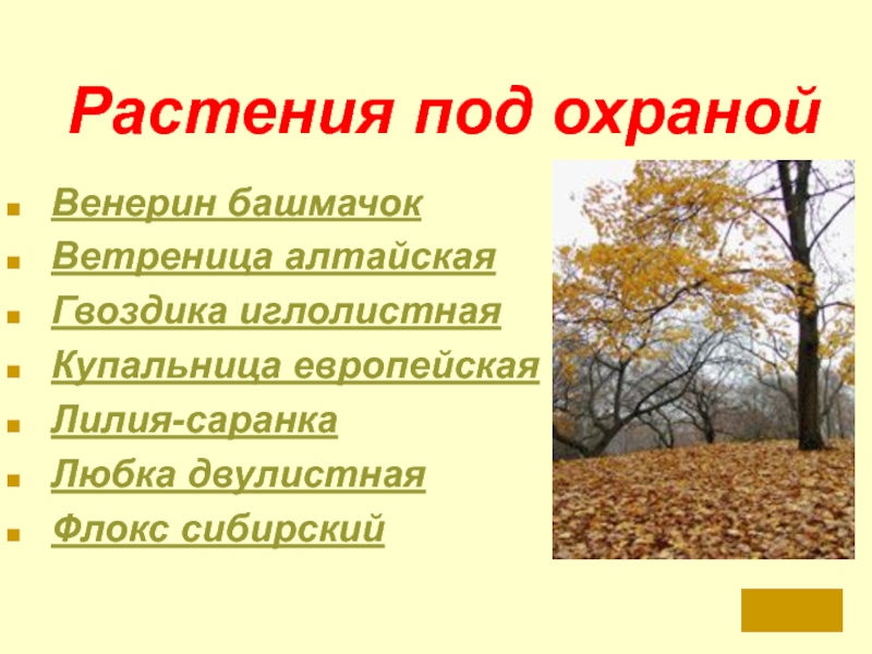 Растения под охранойВенерин башмачокВетреница алтайскаяГвоздика иглолистнаяКупальница европейскаяЛилия-саранкаЛюбка двулистнаяФлокс сибирский