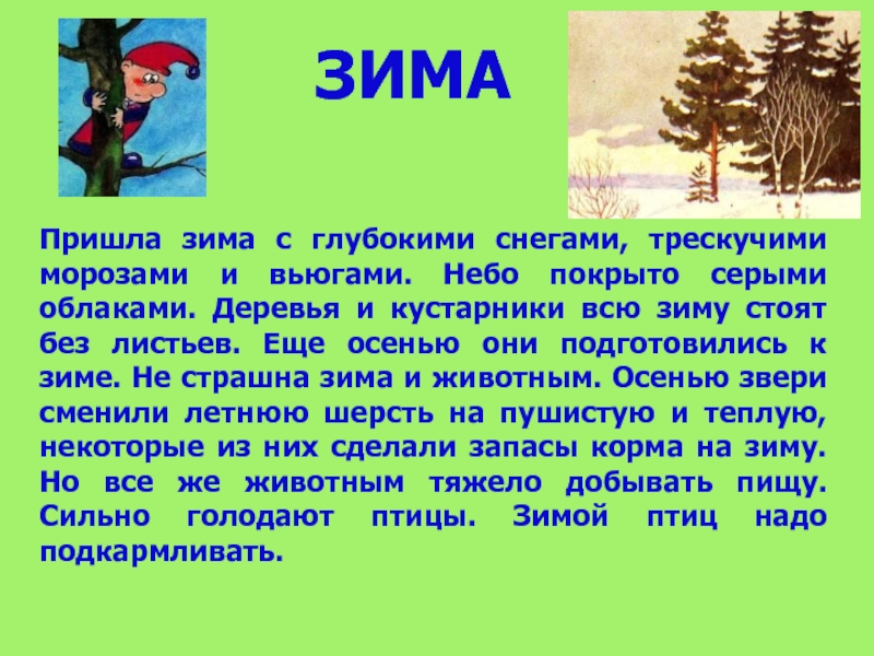 серыми облаками. Деревья и кустарники всю зиму стоят без листьев. Еще осенью они подготовились к зиме. Не страшна зима и животным. Осенью звери сменили летнюю шерсть на пушистую и теплую, некоторые из них сделали запасы корма на зиму. Но все же животным тяжело добывать пищу. Сильно голодают птицы. Зимой птиц надо подкармливать.