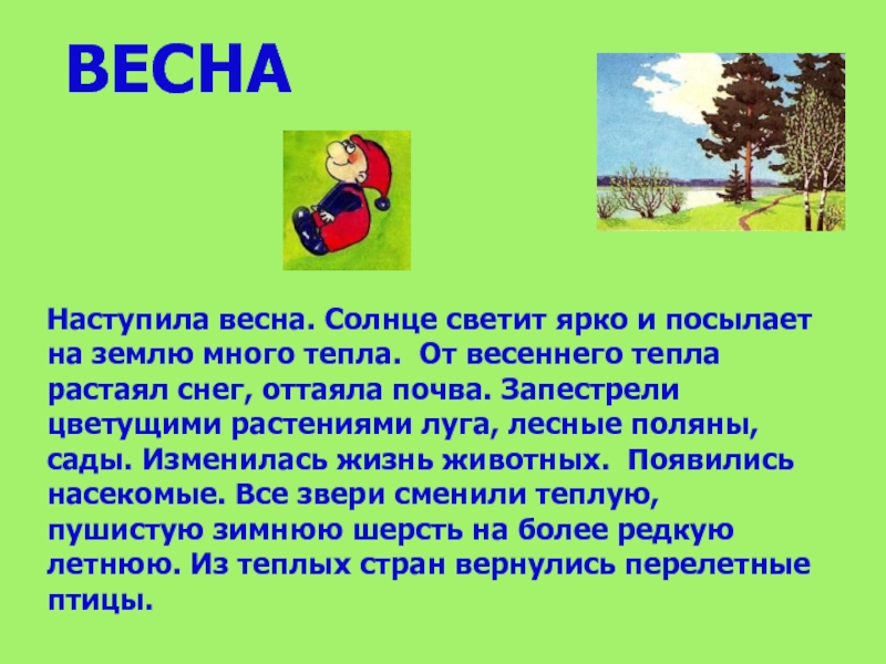 ВЕСНАНаступила весна. Солнце светит ярко и посылает на землю много тепла. От весеннего тепла растаял снег, оттаяла