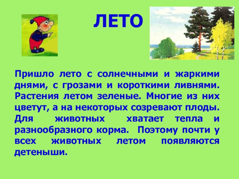 ЛЕТОПришло лето с солнечными и жаркими днями, с грозами и короткими ливнями. Растения летом зеленые. Многие из
