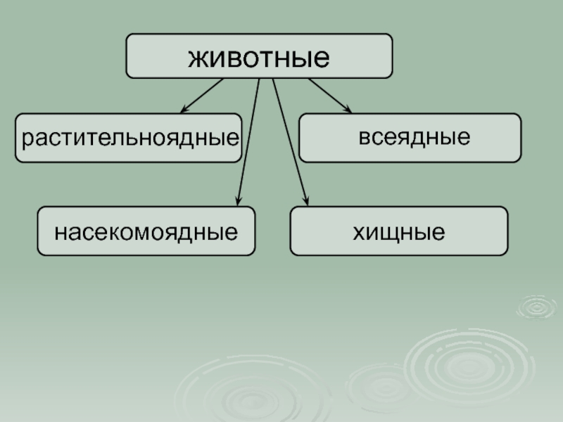 Животные бывают растительно-ядные, насекомоядные, хищные, всеядные.