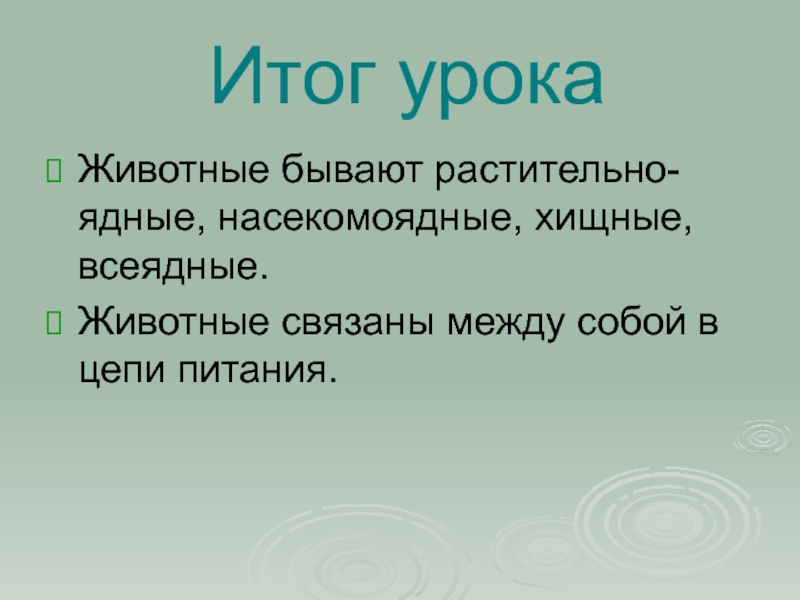 Итог урокаЖивотные бывают растительно-ядные, насекомоядные, хищные, всеядные.Животные связаны между собой в цепи питания.