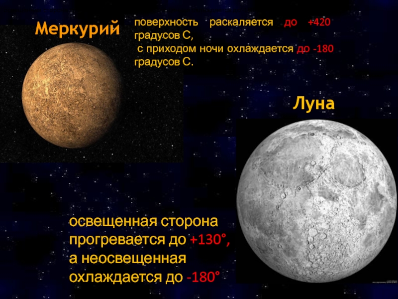 освещенная сторона прогревается до +130°, а неосвещенная охлаждается до -180°).
