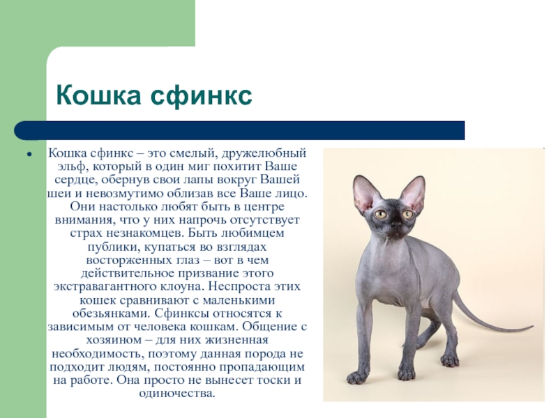 Кошка сфинкс – это смелый, дружелюбный эльф, который в один