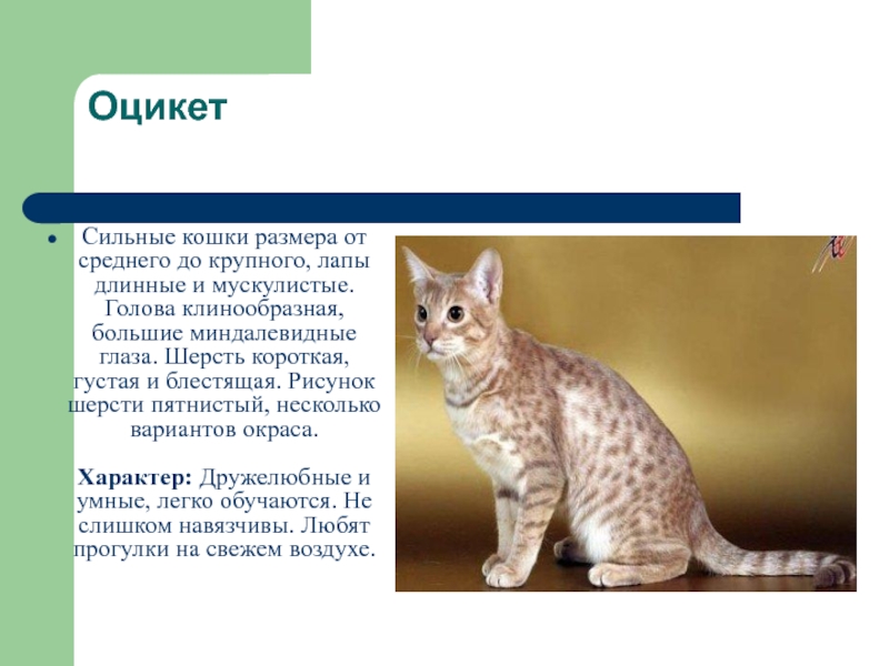 экзотической внешностью. Это кошка здорового типа, лишённого всяческих крайностей, в чём, несомненно, есть своя особая прелесть. Кстати, эти кошки играют почти со всеми предложенными им игрушками и очень любят вскарабкаться куда-нибудь повыше.