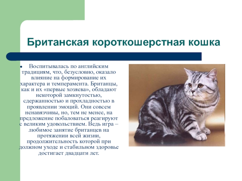 влияние на формирование их характера и темперамента. Британцы, как и их «первые хозяева», обладают некоторой замкнутостью, сдержанностью и прохладностью в проявлении эмоций. Они совсем ненавязчивы, но, тем не менее, на предложение побаловаться реагируют с великим удовольствием. Ведь игра – любимое занятие британцев на протяжении всей жизни, продолжительность которой при должном уходе и стабильном здоровье достигает двадцати лет.
