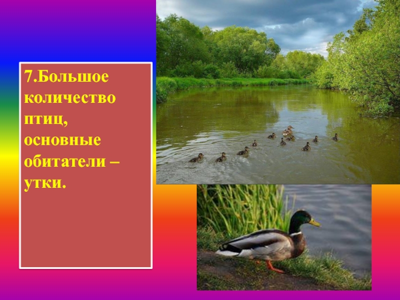 Слайд 57.Большое количество птиц, основные обитатели – утки.