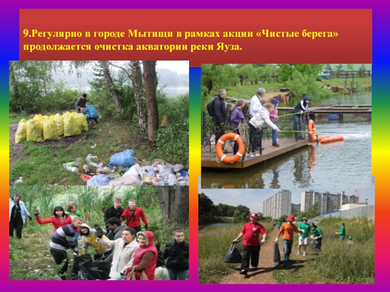 9.Регулярно в городе Мытищи в рамках акции «Чистые берега»  продолжается очистка акватории реки Яуза.