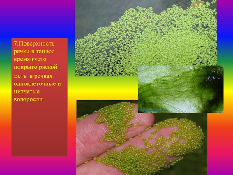 7.Поверхность речки в теплое время густо покрыто ряской Есть  в речках одноклеточные и нитчатые водоросли