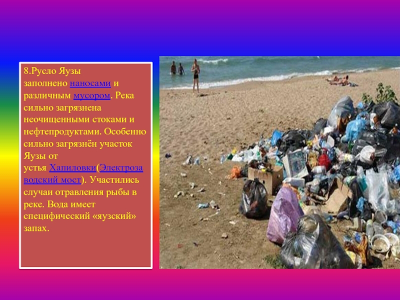 8.Русло Яузы заполнено наносами и различным мусором. Река сильно загрязнена неочищенными стоками и нефтепродуктами. Особенно сильно загрязнён участок Яузы
