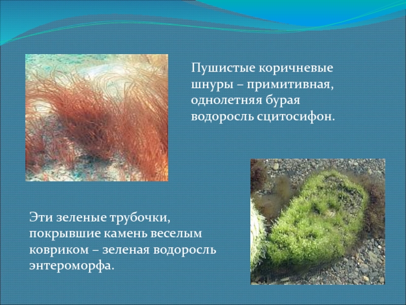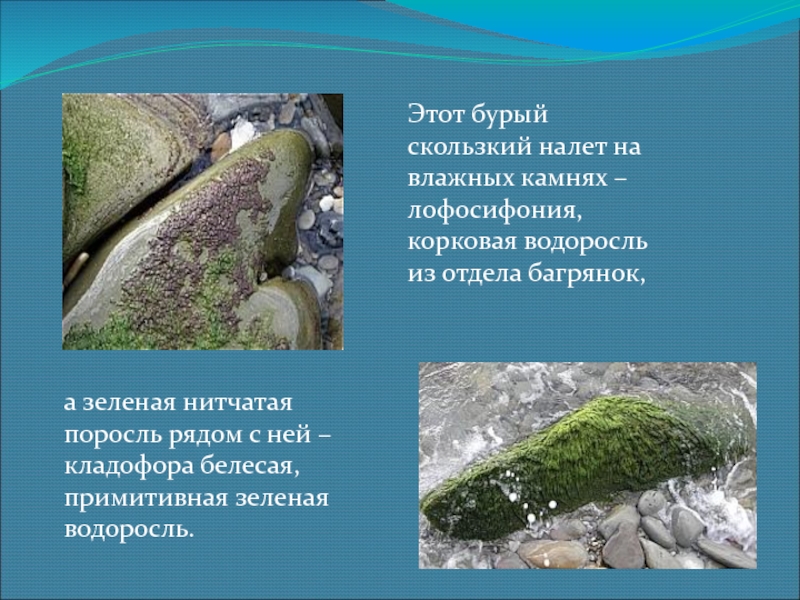 а зеленая нитчатая поросль рядом с ней – кладофора белесая, примитивная зеленая водоросль.