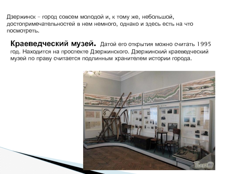 Краеведческий музей. Датой его открытия можно считать 1995 год. Находится на проспекте Дзержинского. Дзержинский краеведческий музей по праву считается подлинным хранителем истории города.