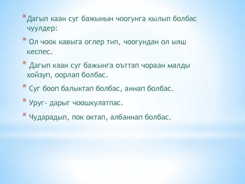 Слайд 8Дагып каан суг бажынын чоогунга кылып болбас чуулдер: