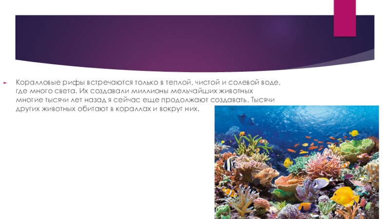 Коралловые рифы встречаются только в теплой, чистой и солевой воде, где много света. Их создавали миллионы мельчайших животных многие тысячи лет назад я сейчас еще продолжают создавать. Тысячи других животных обитают в кораллах и вокруг них.