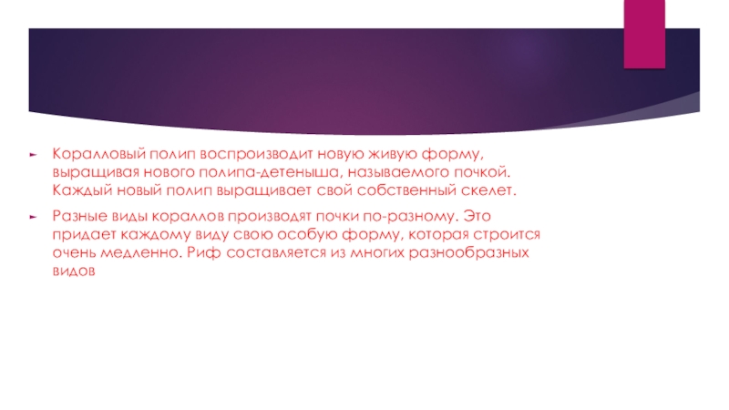 Слайд 4Коралловый полип воспроизводит новую живую форму, выращивая нового полипа-детеныша, называемого почкой.