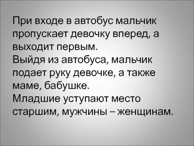 Слайд 19При входе в автобус мальчик пропускает девочку вперед, а выходит первым.