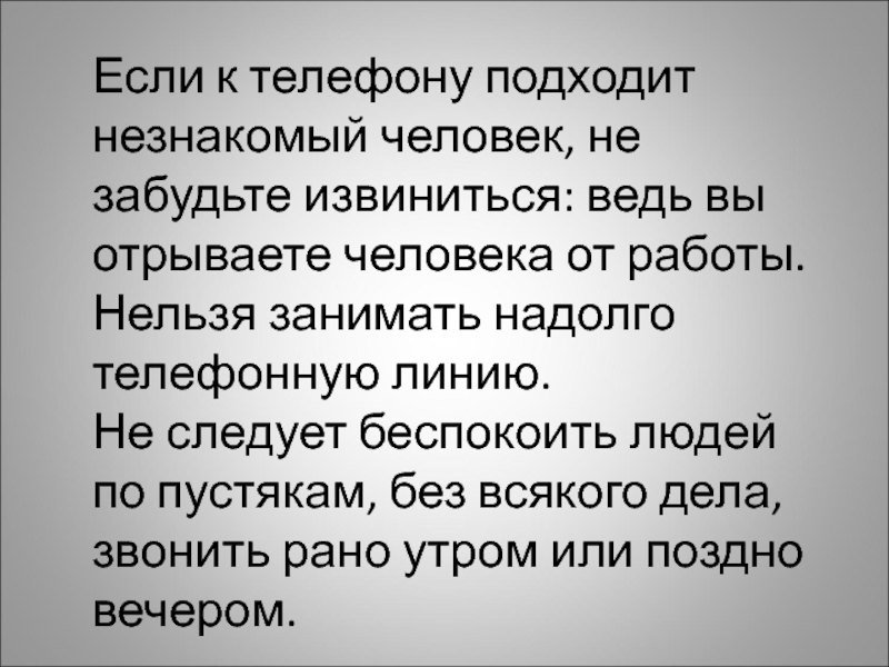 Не следует беспокоить людей по пустякам, без всякого дела, звонить рано утром или поздно вечером.