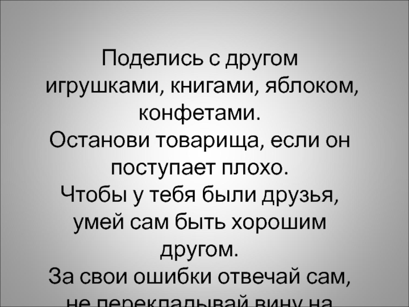 Слайд 4Поделись с другом игрушками, книгами, яблоком, конфетами.