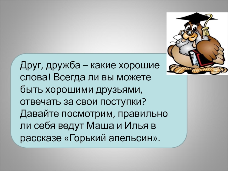 хорошими друзьями, отвечать за свои поступки? Давайте посмотрим, правильно ли себя ведут Маша и Илья в рассказе «Горький апельсин».