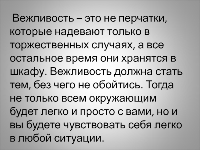 Слайд 23 Вежливость – это не перчатки, которые надевают только в торжественных