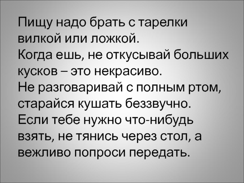 Не разговаривай с полным ртом, старайся кушать беззвучно.