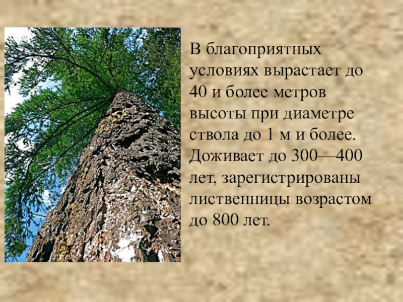 диаметре ствола до 1 м и более. Доживает до 300—400 лет, зарегистрированы лиственницы возрастом до 800 лет.