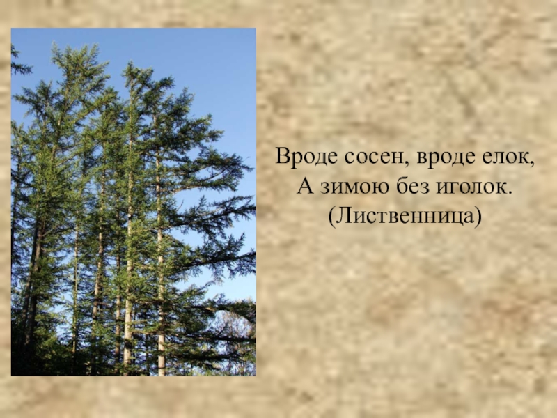 Слайд 2Вроде сосен, вроде елок, А зимою без иголок. (Лиственница)