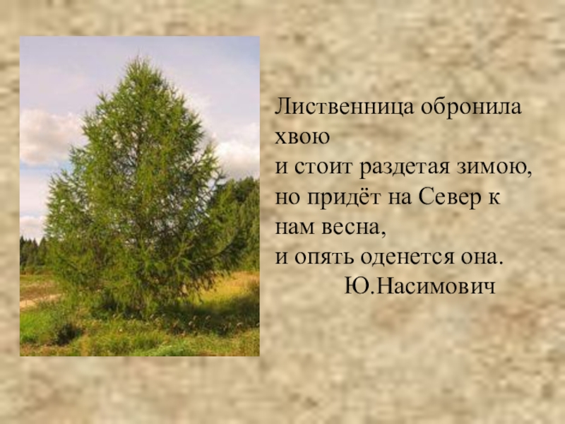 Слайд 11Лиственница обронила хвою и стоит раздетая зимою, но придёт на Север к нам