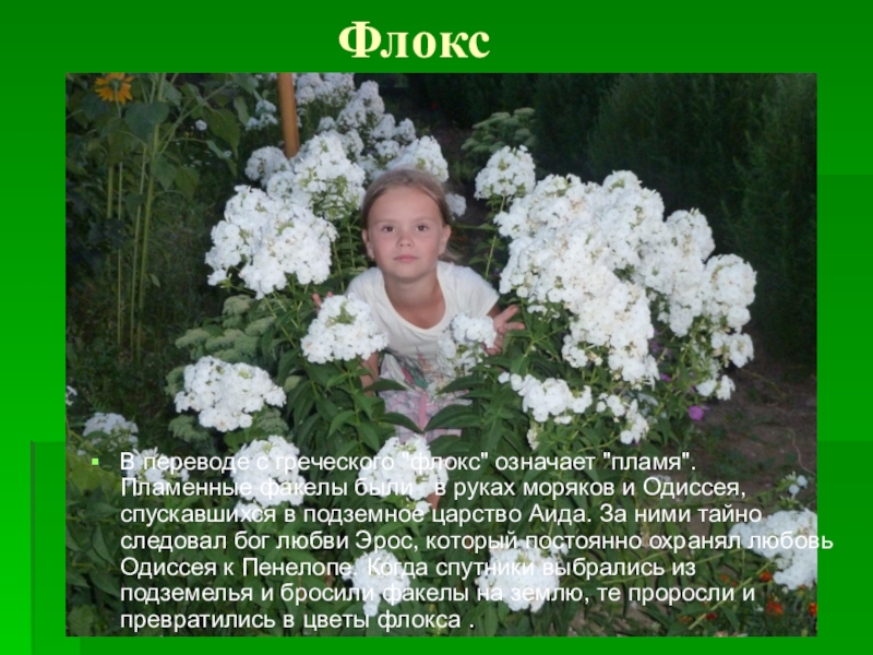 В переводе с греческого "флокс" означает "пламя". Пламенные факелы были в руках моряков и Одиссея, спускавшихся в подземное царство Аида. За ними тайно следовал бог любви Эрос, который постоянно охранял любовь Одиссея к Пенелопе. Когда спутники выбрались из подземелья и бросили факелы на землю, те проросли и превратились в цветы флокса .