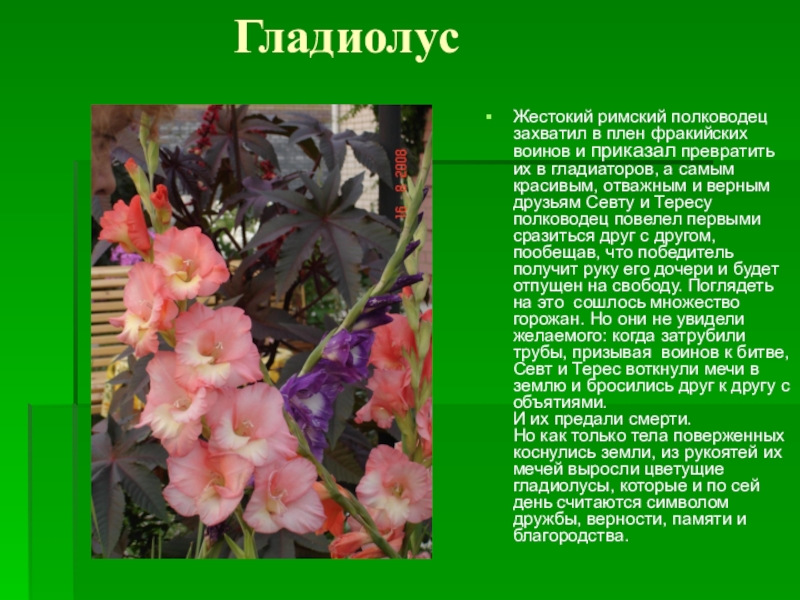 Но как только тела поверженных коснулись земли, из рукоятей их мечей выросли цветущие гладиолусы, которые и по сей день считаются символом дружбы, верности, памяти и благородства.