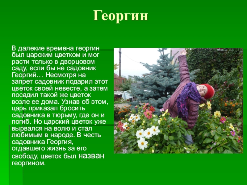 времена георгин был царским цветком и мог расти только в дворцовом саду, если бы не садовник Георгий… Несмотря на запрет садовник подарил этот цветок своей невесте, а затем посадил такой же цветок возле ее дома. Узнав об этом, царь приказал бросить садовника в тюрьму, где он и погиб. Но царский цветок уже вырвался на волю и стал любимым в народе. В честь садовника Георгия, отдавшего жизнь за его свободу, цветок был назван георгином.