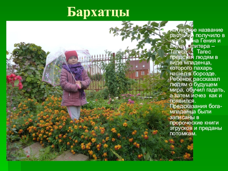 честь сына Гения и внука Юпитера – Тагеса . Тагес предстал людям в виде младенца, которого пахарь нашёл в борозде. Ребёнок рассказал людям о будущем мира, обучил гадать, а затем исчез как и появился. Предсказания бога-младенца были записаны в пророческие книги этрусков и преданы потомкам.