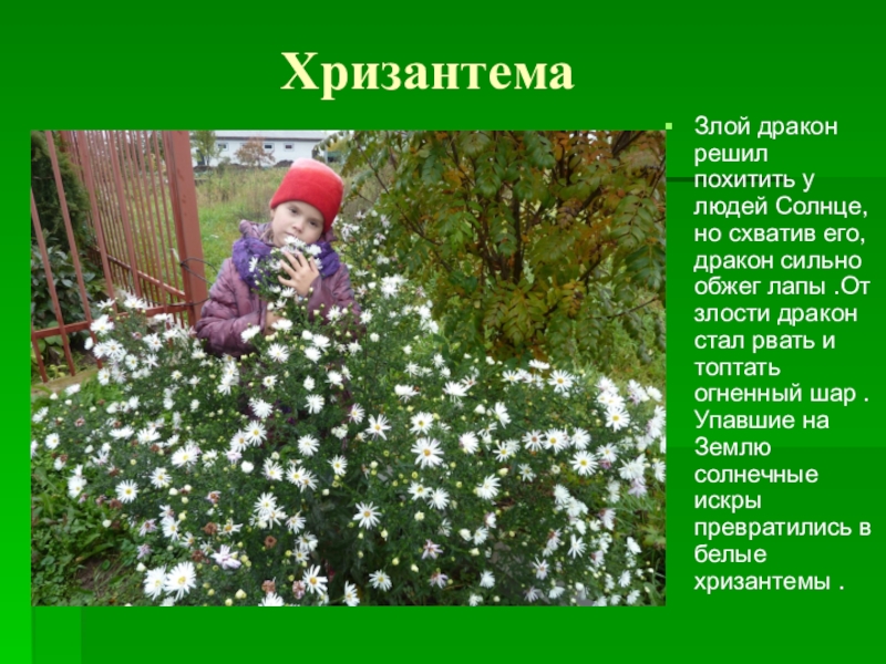 людей Солнце, но схватив его, дракон сильно обжег лапы .От злости дракон стал рвать и топтать огненный шар .Упавшие на Землю солнечные искры превратились в белые хризантемы .