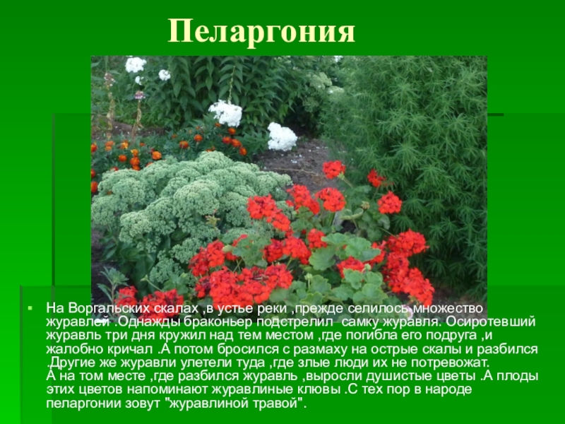 А на том месте ,где разбился журавль ,выросли душистые цветы .А плоды этих цветов напоминают журавлиные клювы .С тех пор в народе пеларгонии зовут "журавлиной травой".