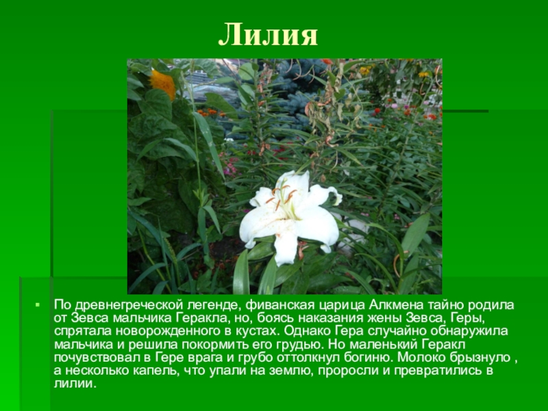 фиванская царица Алкмена тайно родила от Зевса мальчика Геракла, но, боясь наказания жены Зевса, Геры, спрятала новорожденного в кустах. Однако Гера случайно обнаружила мальчика и решила покормить его грудью. Но маленький Геракл почувствовал в Гере врага и грубо оттолкнул богиню. Молоко брызнуло , а несколько капель, что упали на землю, проросли и превратились в лилии.