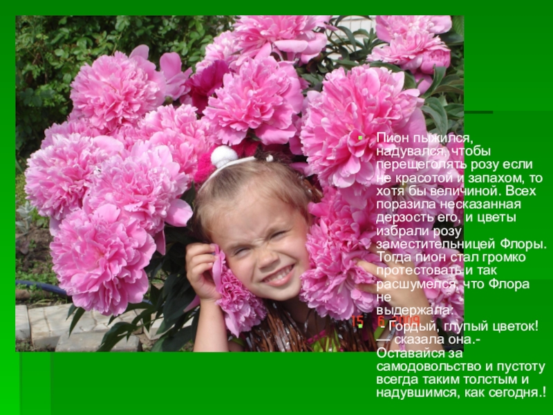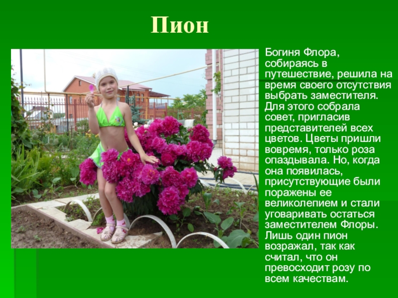 путешествие, решила на время своего отсутствия выбрать заместителя. Для этого собрала совет, пригласив представителей всех цветов. Цветы пришли вовремя, только роза опаздывала. Но, когда она появилась, присутствующие были поражены ее великолепием и стали уговаривать остаться заместителем Флоры. Лишь один пион возражал, так как считал, что он превосходит розу по всем качествам.