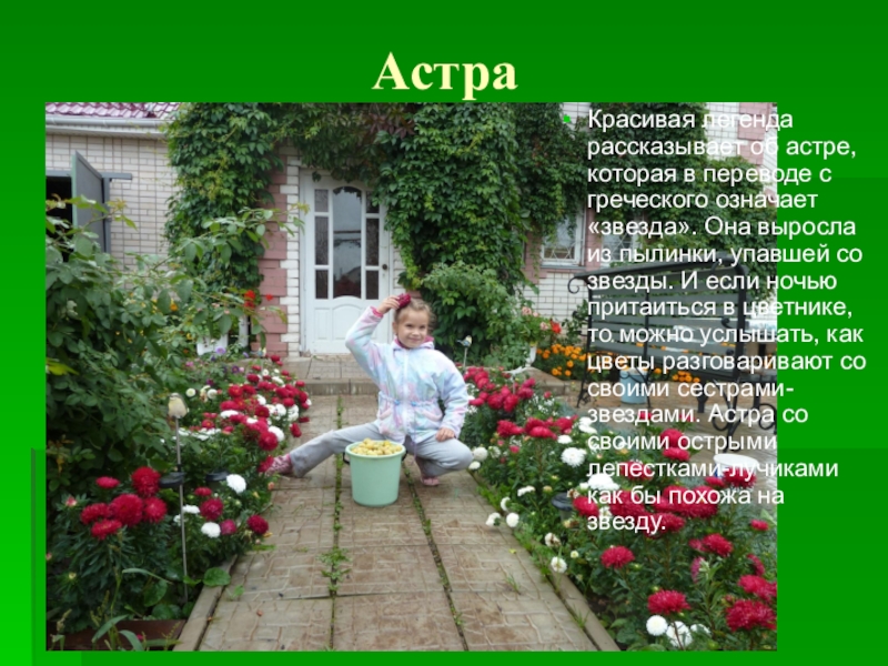 об астре, которая в переводе с греческого означает «звезда». Она выросла из пылинки, упавшей со звезды. И если ночью притаиться в цветнике, то можно услышать, как цветы разговаривают со своими сестрами-звездами. Астра со своими острыми лепестками-лучиками как бы похожа на звезду.