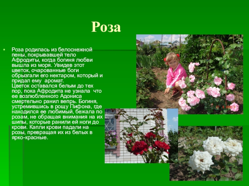 Цветок оставался белым до тех пор, пока Афродита не узнала что ее возлюбленного Адониса смертельно ранил вепрь. Богиня, устремившись в рощу Пифона, где находился ее любимый, бежала по розам, не обращая внимания на их шипы, которые ранили ей ноги до крови. Капли крови падали на розы, превращая их из белых в ярко-красные.