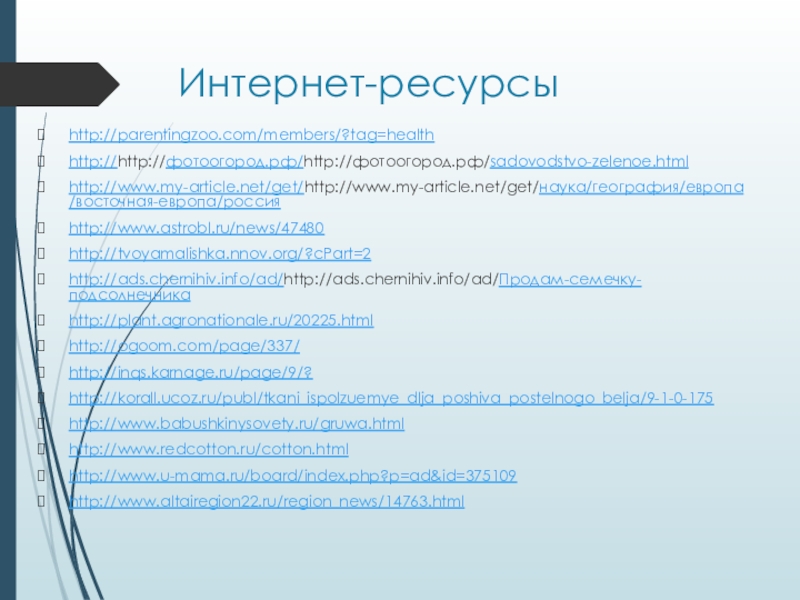 Интернет-ресурсыhttp://parentingzoo.com/members/?tag=health http://http://фотоогород.рф/http://фотоогород.рф/sadovodstvo-zelenoe.html http://www.my-article.net/get/http://www.my-article.net/get/наука/география/европа/восточная-европа/россияhttp://www.astrobl.ru/news/47480http://tvoyamalishka.nnov.org/?cPart=2http://ads.chernihiv.info/ad/http://ads.chernihiv.info/ad/Продам-семечку-подсолнечникаhttp://plant.agronationale.ru/20225.html http://ogoom.com/page/337/ http://inqs.karnage.ru/page/9/? http://korall.ucoz.ru/publ/tkani_ispolzuemye_dlja_poshiva_postelnogo_belja/9-1-0-175 http://www.babushkinysovety.ru/gruwa.htmlhttp://www.redcotton.ru/cotton.htmlhttp://www.u-mama.ru/board/index.php?p=ad&id=375109http://www.altairegion22.ru/region_news/14763.html