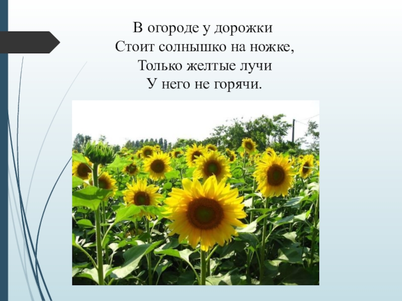 В огороде у дорожки Стоит солнышко на ножке, Только желтые лучи У него не горячи.