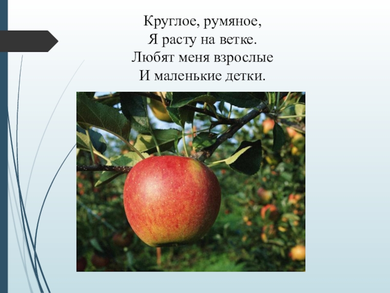 Круглое, румяное,Я расту на ветке.Любят меня взрослыеИ маленькие детки.