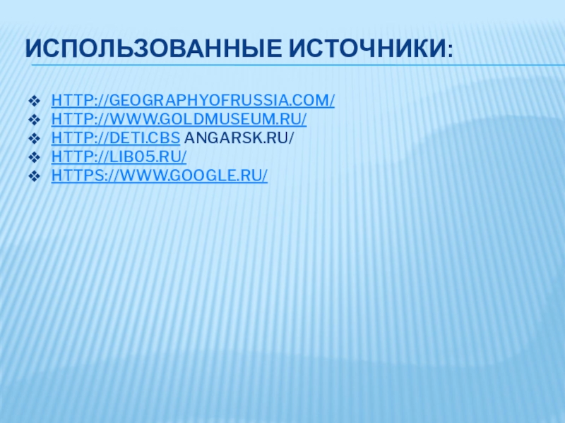 ИСПОЛЬЗОВАННЫЕ ИСТОЧНИКИ: HTTP://GEOGRAPHYOFRUSSIA.COM/HTTP://WWW.GOLDMUSEUM.RU/HTTP://DETI.CBS ANGARSK.RU/HTTP://LIB05.RU/HTTPS://WWW.GOOGLE.RU/