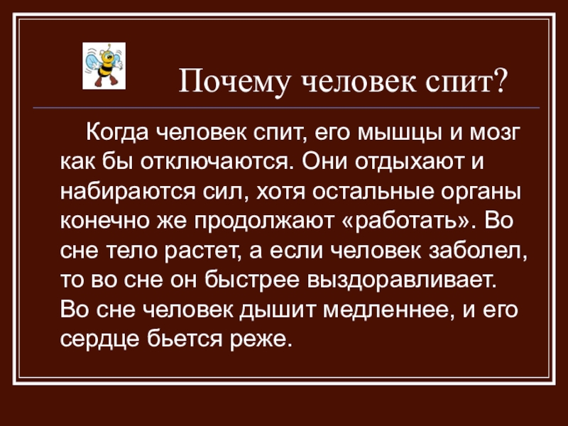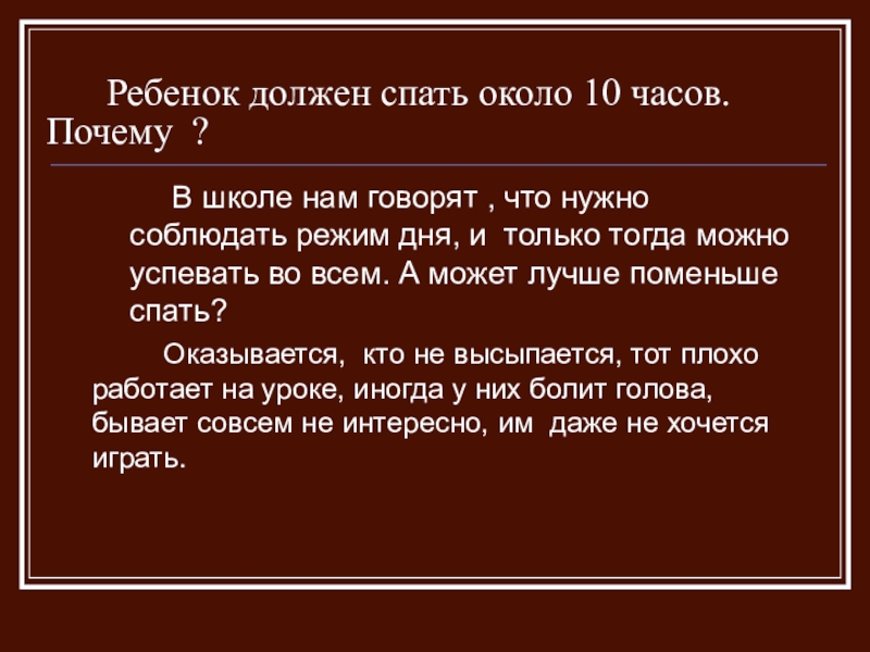 Оказывается, кто не высыпается, тот плохо работает на уроке, иногда у них болит голова, бывает совсем не интересно, им даже не хочется играть.