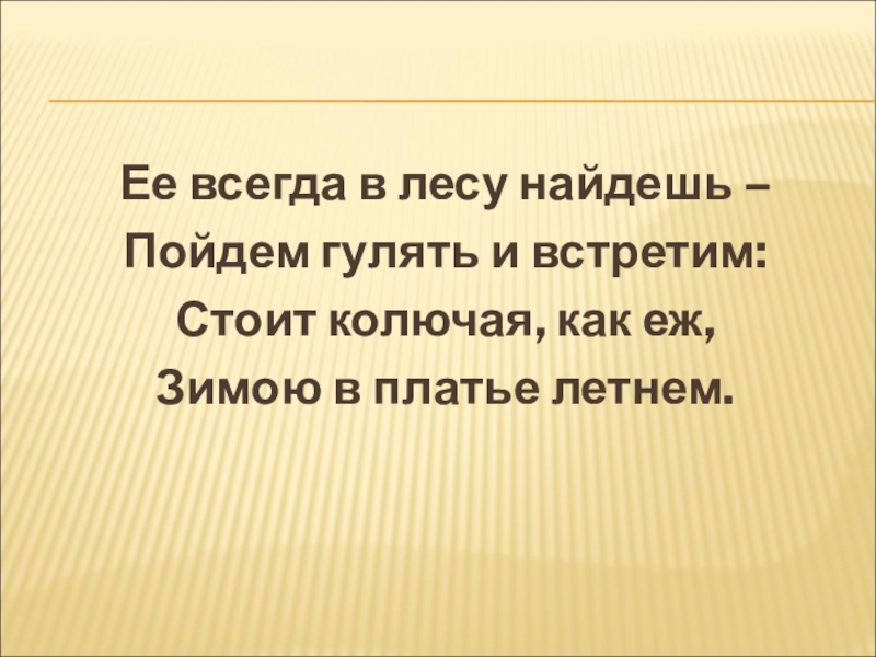 Ее всегда в лесу найдешь –Пойдем гулять и встретим:Стоит колючая, как еж,Зимою в платье летнем.