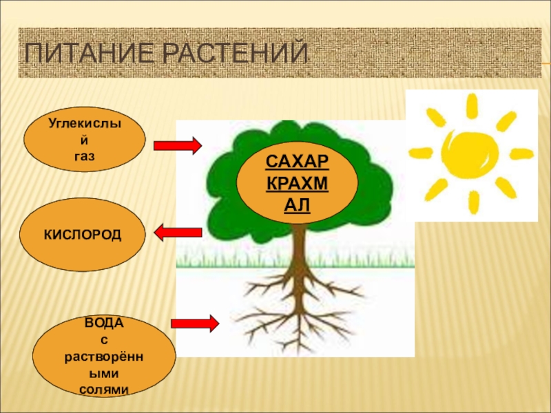 ПИТАНИЕ РАСТЕНИЙУглекислыйгазКИСЛОРОДВОДА с растворённымисолямиСАХАРКРАХМАЛ