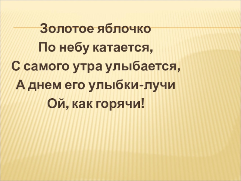 Золотое яблочкоПо небу катается, С самого утра улыбается,А днем его улыбки-лучиОй, как горячи!