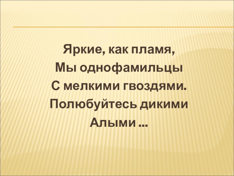 Яркие, как пламя,Мы однофамильцыС мелкими гвоздями.Полюбуйтесь дикимиАлыми ...