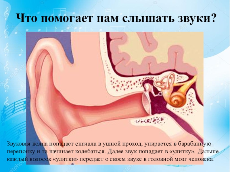 Что помогает нам слышать звуки?Звуковая волна попадает сначала в ушной проход, упирается в барабанную перепонку и та
